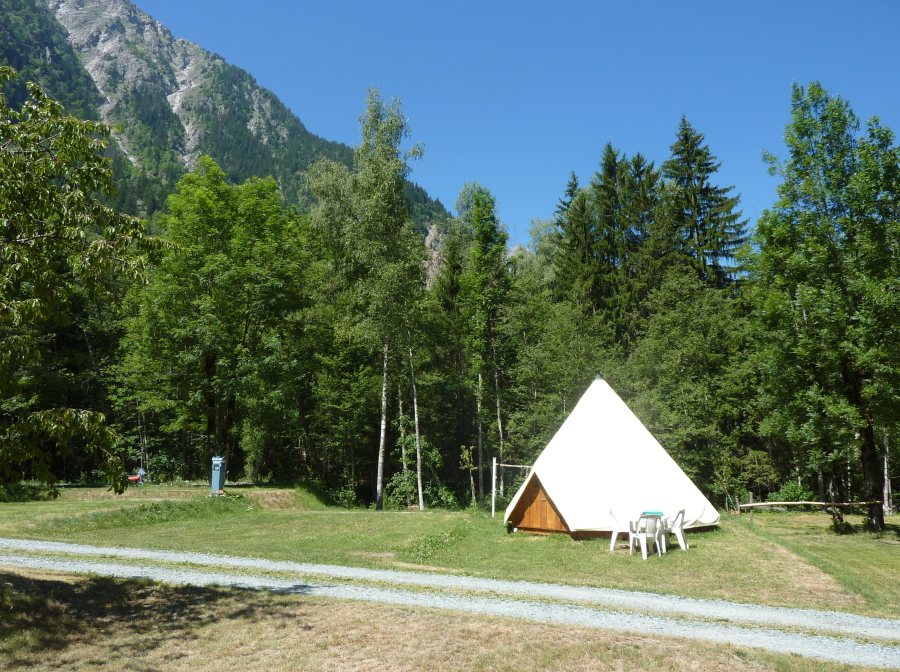Les tipis sont installés dans les zones calmes du camping, choisies pour leur tranquillité et leur intégration naturelle dans le paysage. Ici, pas de vis-à-vis omniprésent, pas de nuisances. Les nuits sont paisibles, rythmées par les sons discrets de la vallée du Vénéon.
