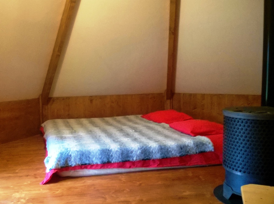L’espace nuit se compose d’un lit double de 160 cm et d’un lit simple de 90 cm. Les draps, couvertures et le linge de couchage sont fournis, permettant une installation immédiate et confortable dès l’arrivée. Le mobilier en bois, simple et fonctionnel, comprend des coffres et une armoire de rangement, afin de garder un espace ordonné et agréable à vivre.